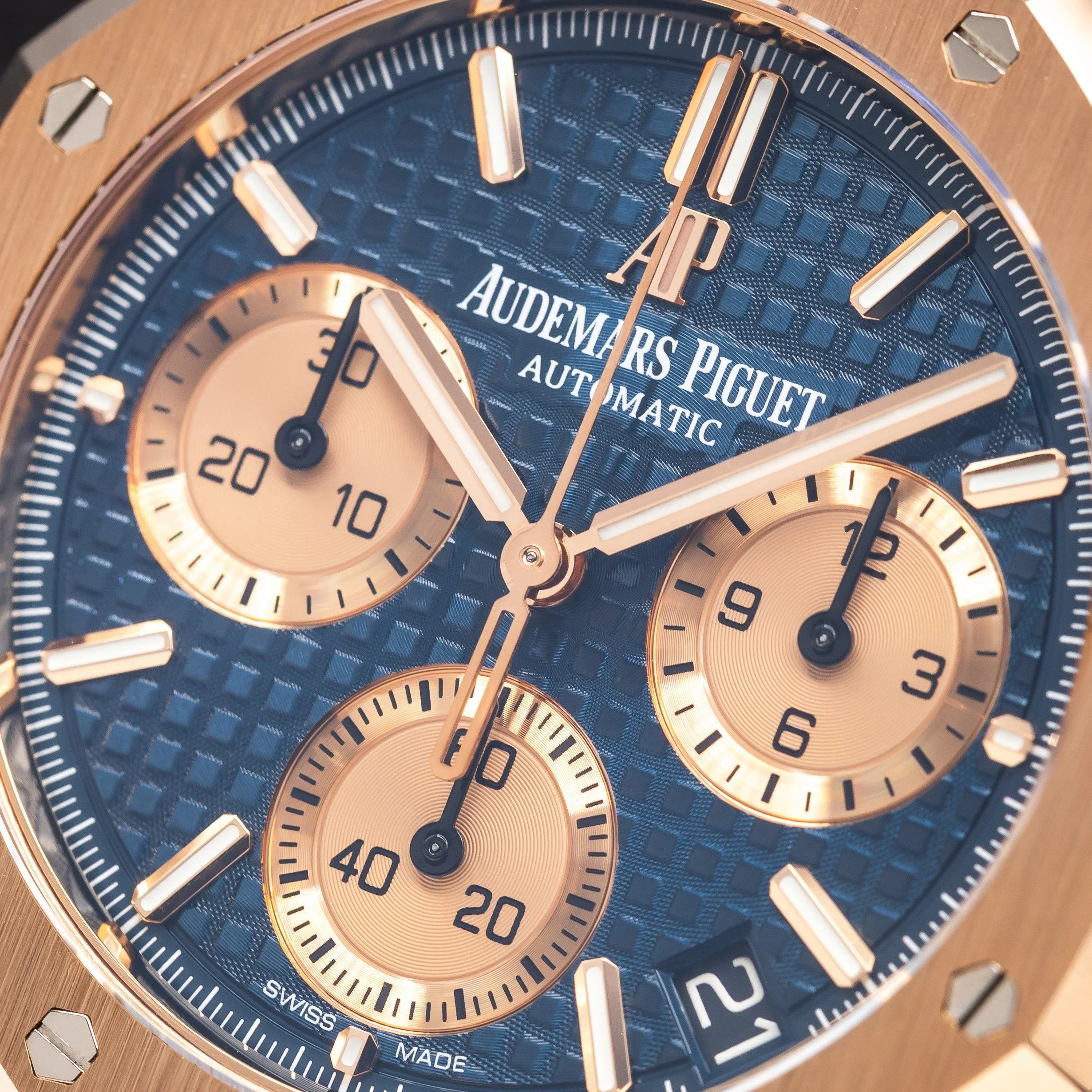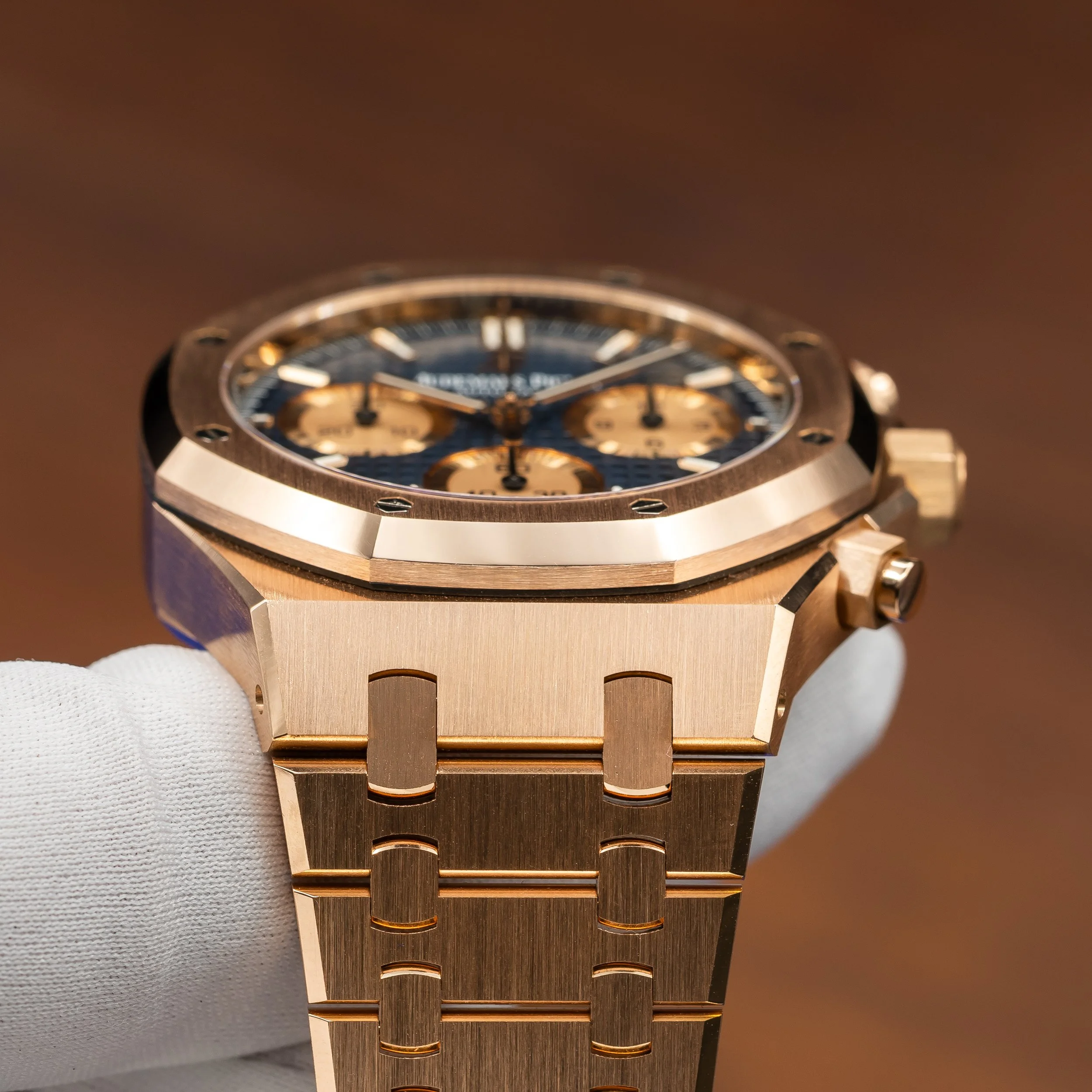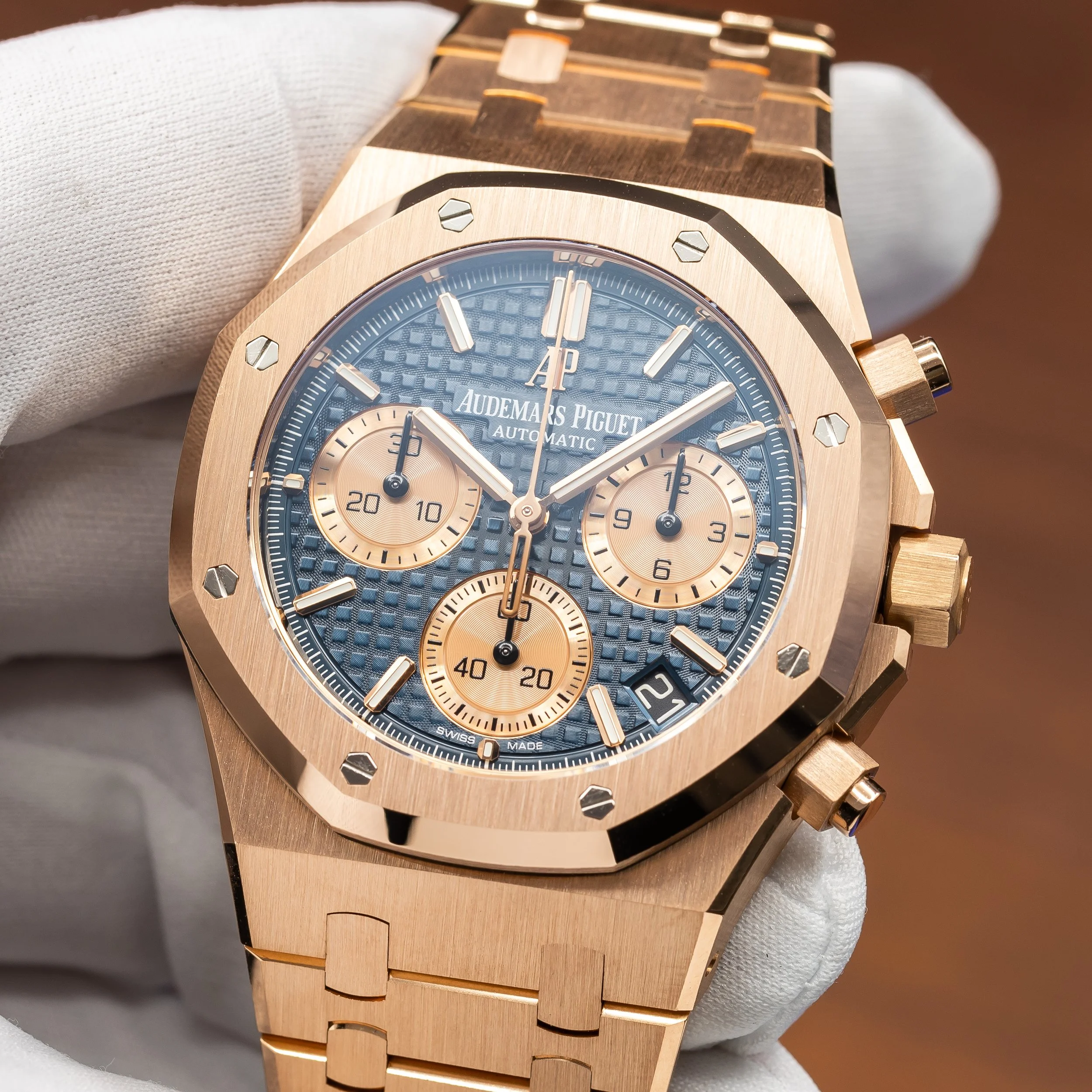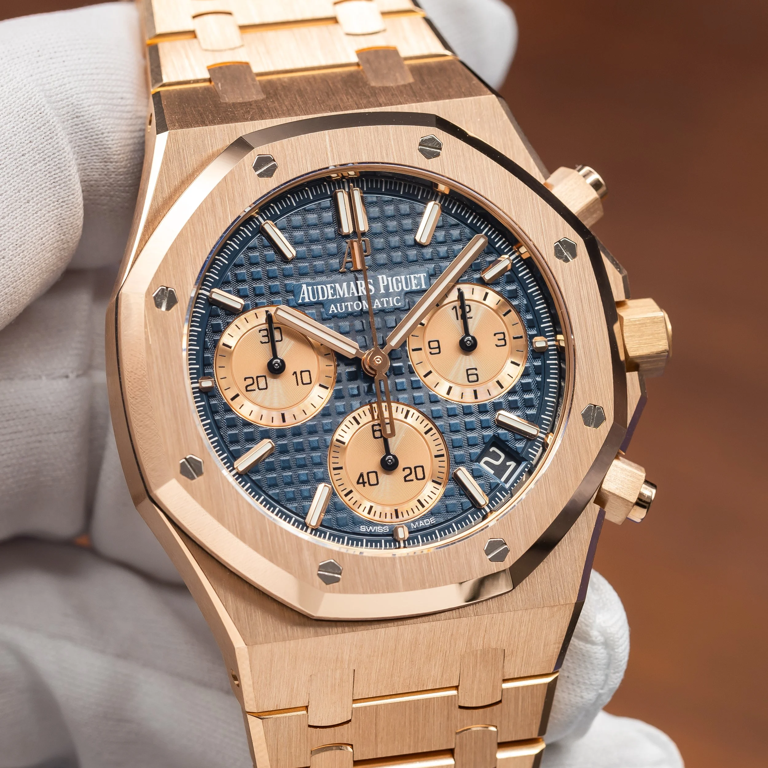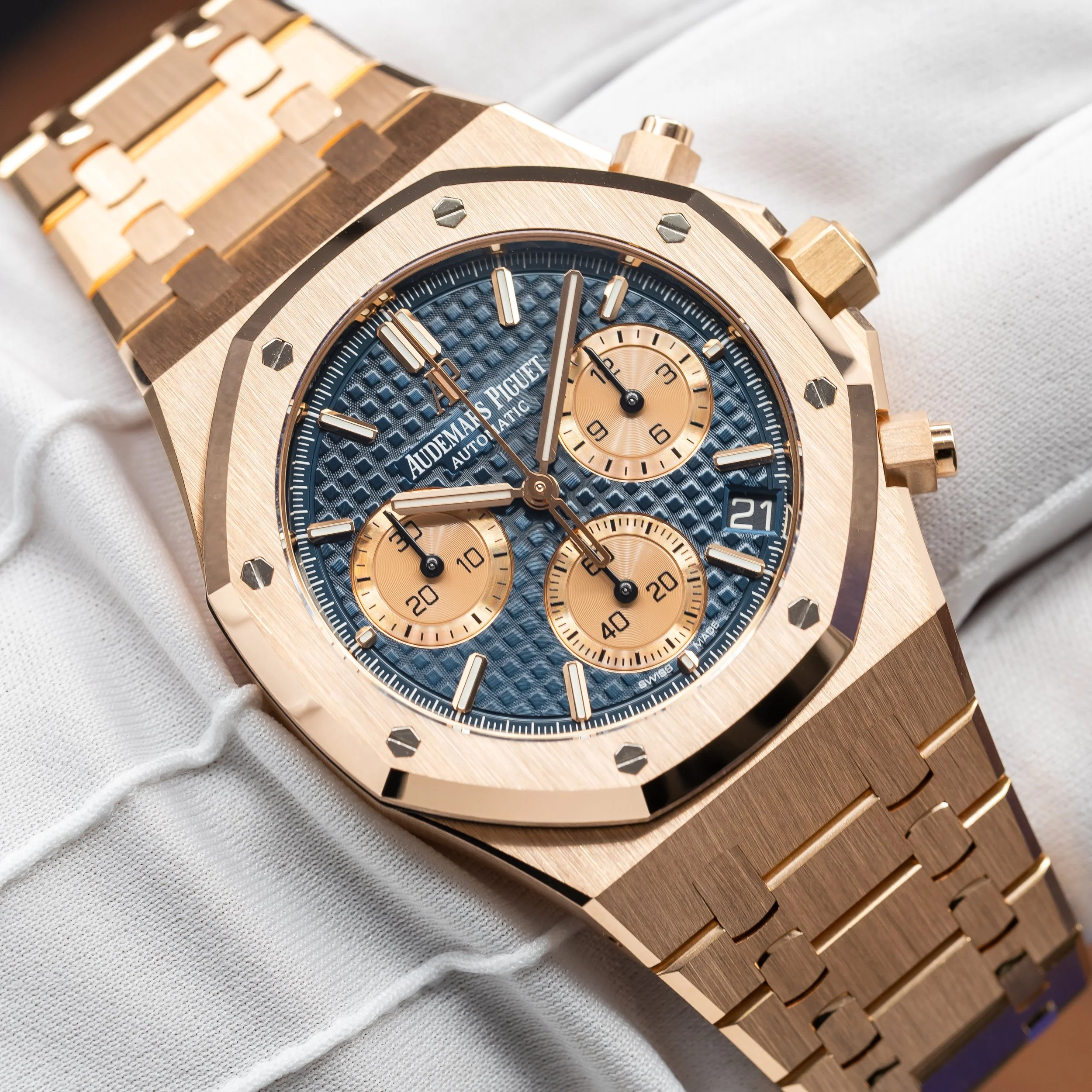 The Audemars Piguet Royal Oak Chrono reference 26239OR.OO.1220OR.01 is a modern execution of the brand’s iconic integrated sports chronograph. Produced in 2021, this configuration features a blue “Grande Tapisserie” dial paired with a contrasting gold subdials and the unmistakable Royal Oak integrated bracelet in 18k rose gold. The 41 mm case maintains the sharp geometry and finishing that define the Royal Oak line while preserving its recognizable octagonal design.