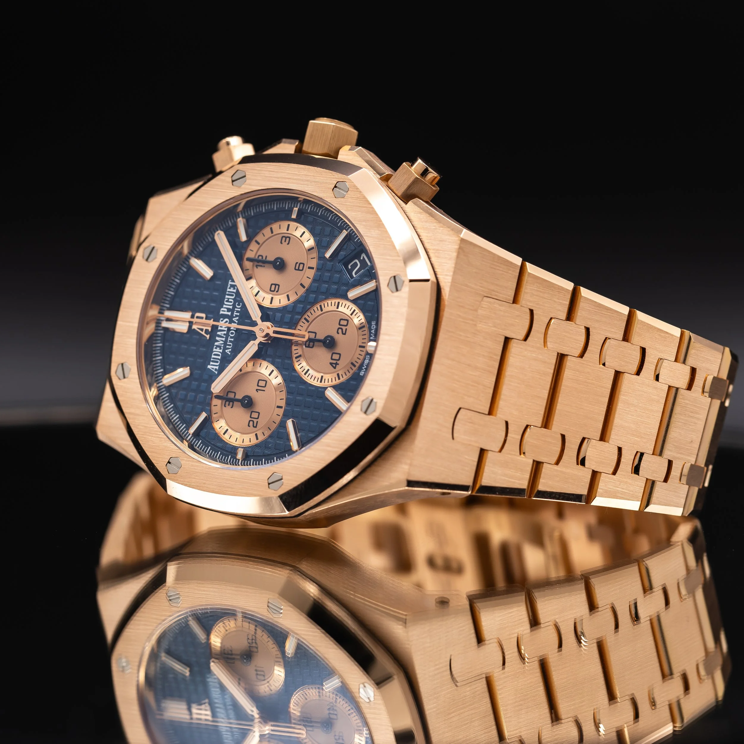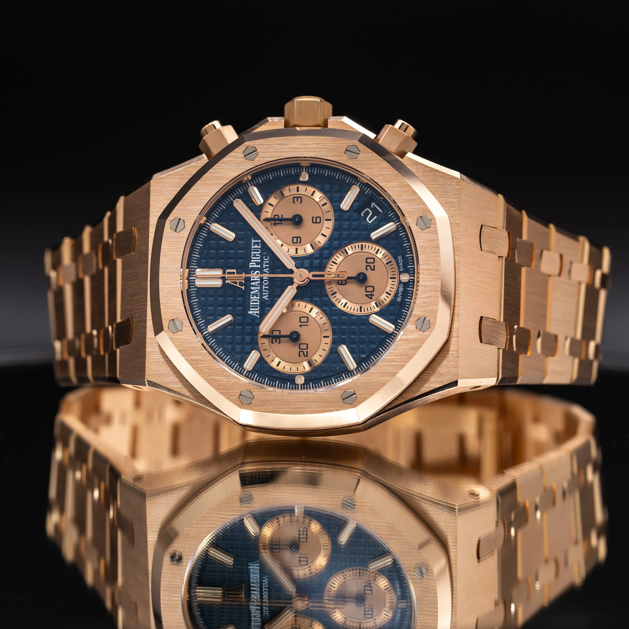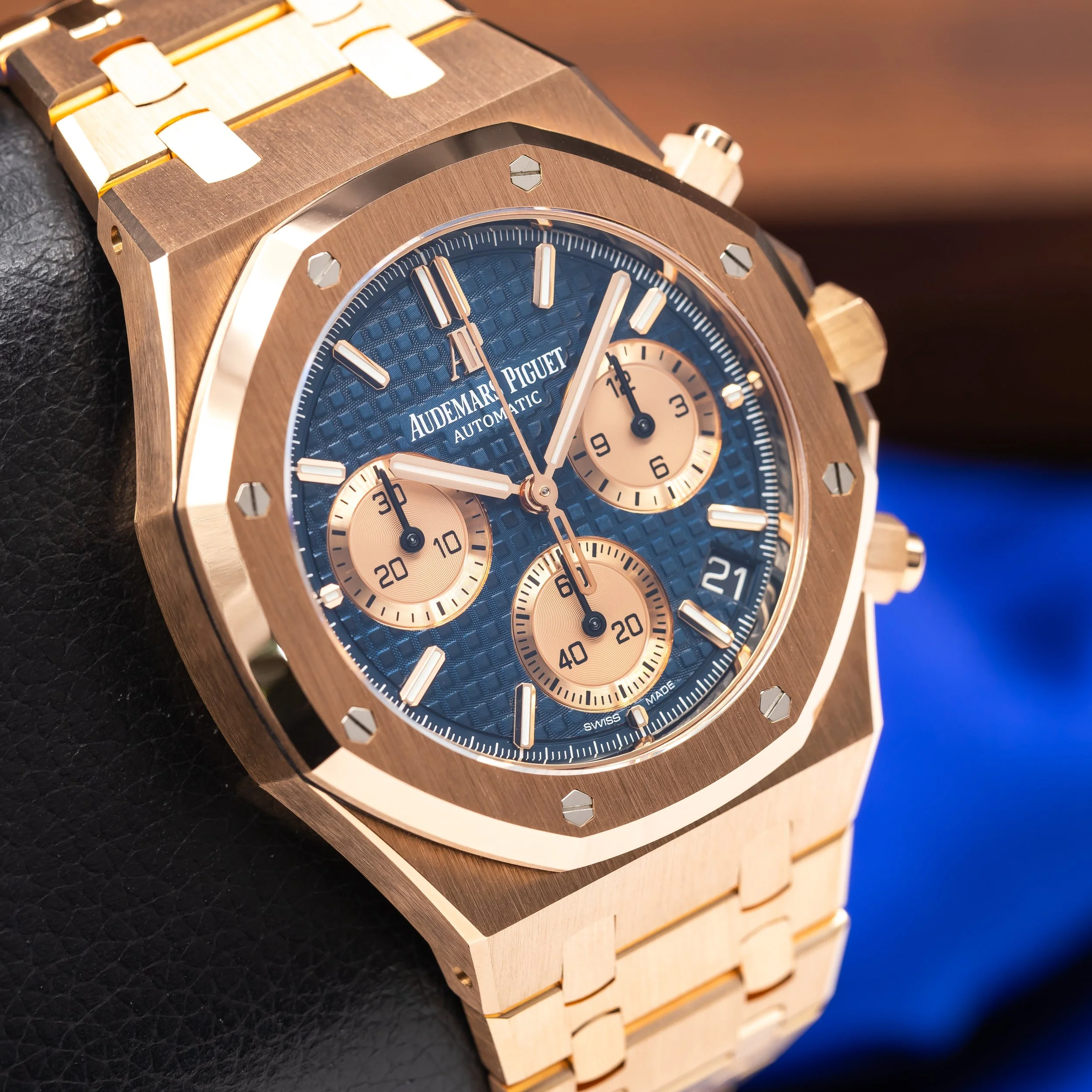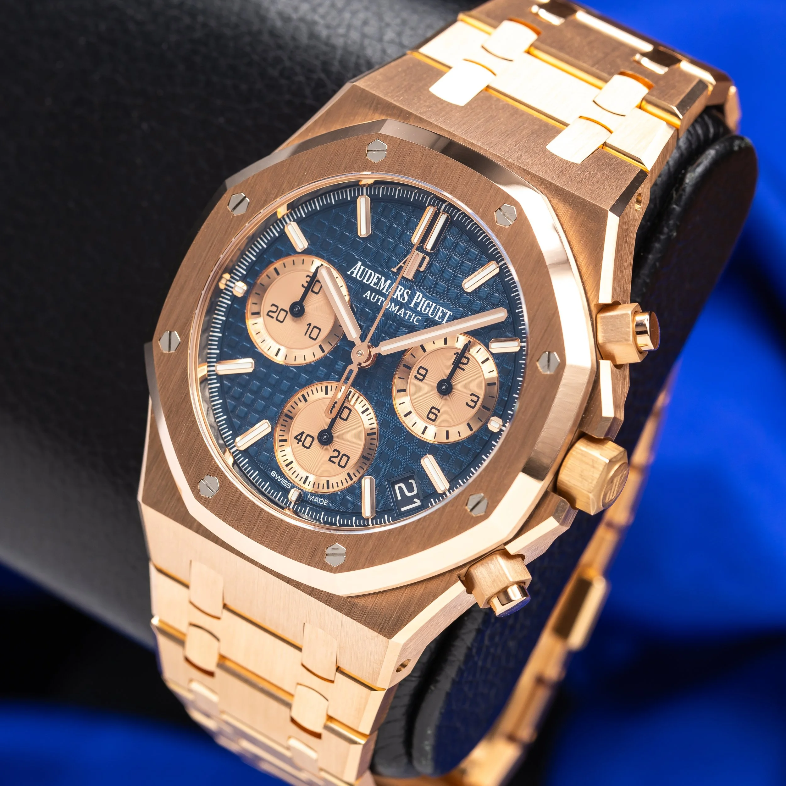 The Royal Oak Chronograph remains one of the most sought-after contemporary sports chronographs in the luxury market. Full rose gold configurations with the classic blue dial offer a strong visual presence while maintaining the timeless Royal Oak design language. Demand for modern Royal Oak chronographs continues to remain extremely strong among collectors and enthusiasts alike.